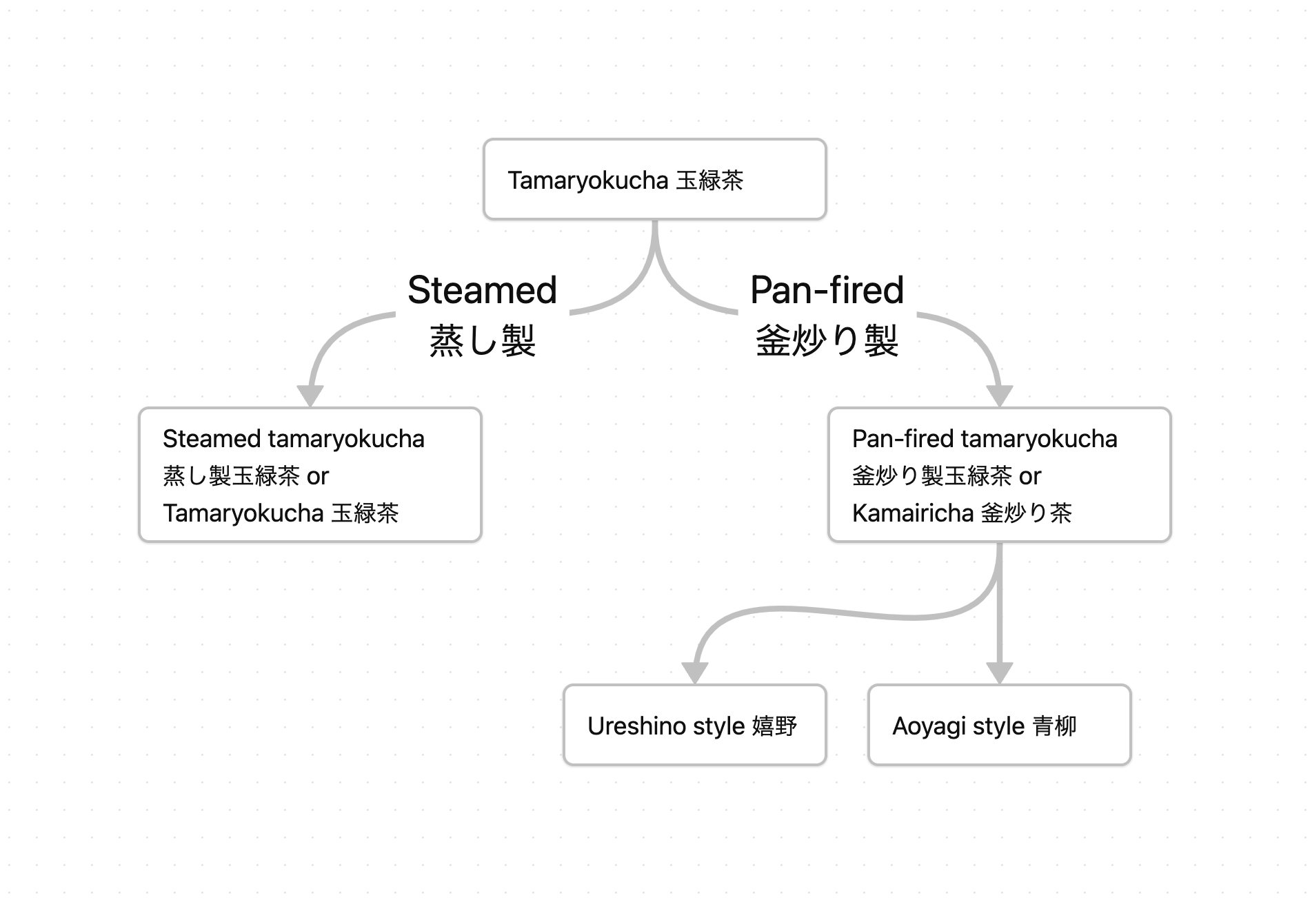 The pan-fired one is usually known as Kamairicha 釜炒り茶 alone, adding to the possible confusion. While the steamed processed one is regarded simply as Tamaryokucha. The steamed version of Tamaryokucha 玉緑茶 tried to simulate the Kamairicha process while improving the production volume and human labour costs. Together with certain developments around the early 1890s with Japanese tea exports, both versions remain.